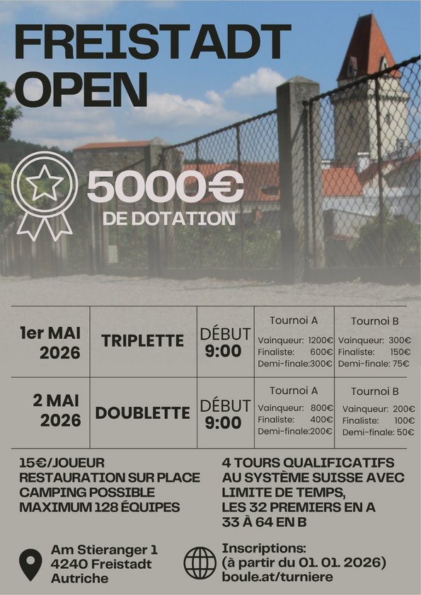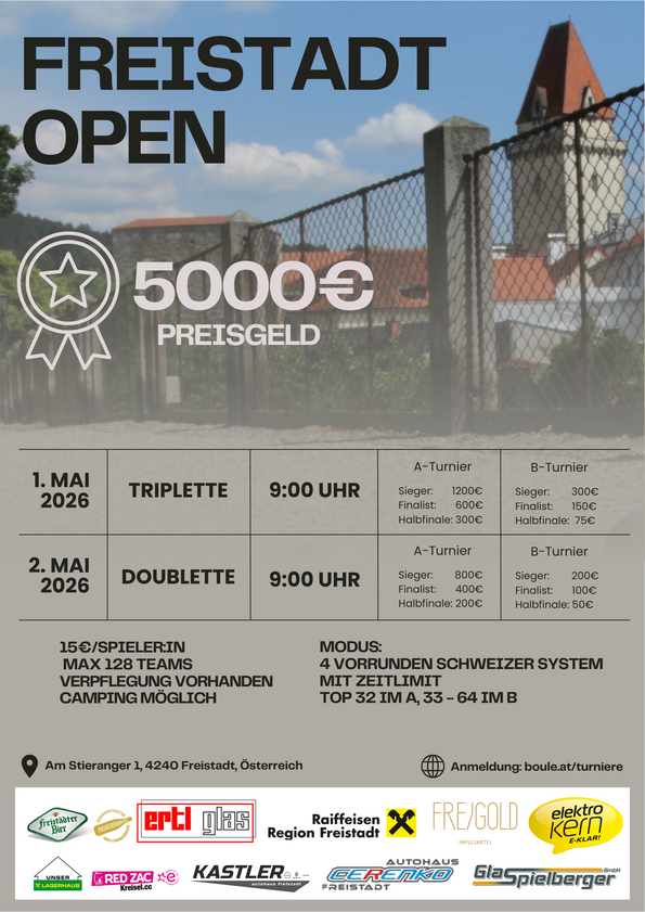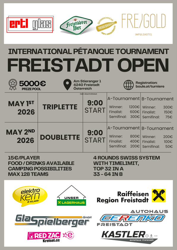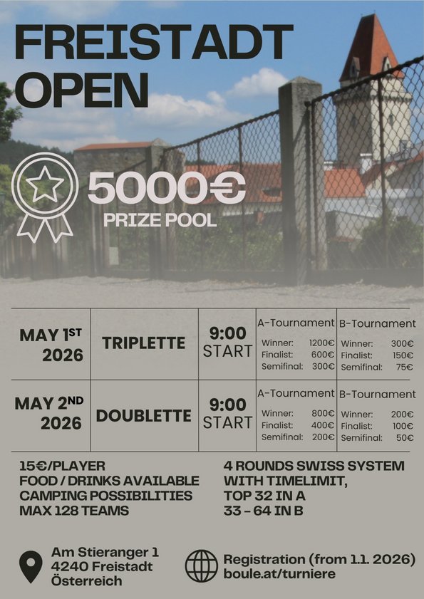 For those of you who are already familiar with Freistadt as a venue for various tournaments, there is one change: The weekend will not take place on the promenade - the conditions there do not allow for more than 25 lanes - but on a large fairground with an adjoining lounge and excellent facilities directly in Freistadt at Am Stieranger 1, 4240 Freistadt (incidentally, very close to the bus station, so accessible by public transport).We will open registration for this on January 1, 2026, so that foreign teams can also plan their trip early enough. (boule.at/turniere, max. 128 teams)